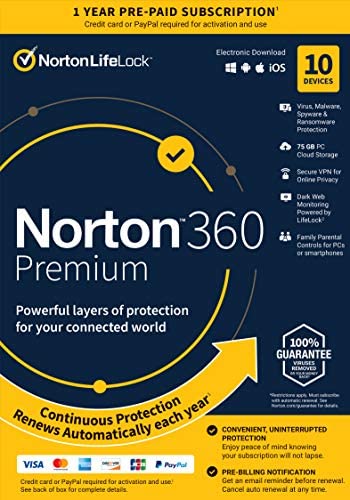 Norton 360 Premium 2022 Antivirus software for 10 Devices with Auto Renewal – Includes VPN, PC Cloud Backup & Dark Web Monitoring [Key card]